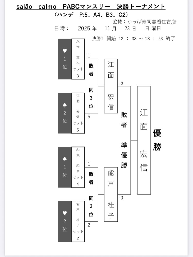 こんにちは 第19回サラオンカルモPABCマンスリーの結果を 写真にて、お知らせ致します。 参加者の7名の皆さま方、お疲れ様でした☆