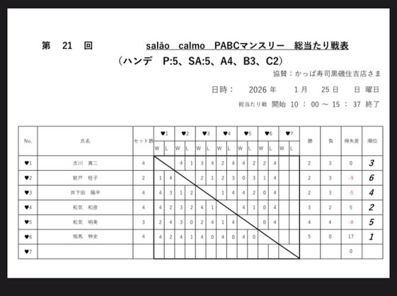 こんにちは 第21回サラオンカルモPABCマンスリーの結果を 写真にて、お知らせ致します。 参加者の6名の皆さま方、お疲れ様でした☆