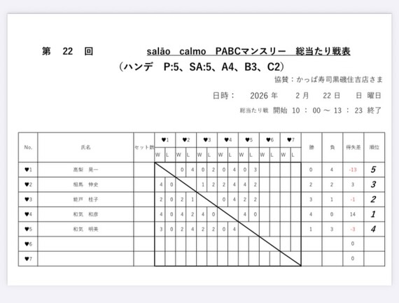 第22回サラオンカルモPABCマンスリーの結果を